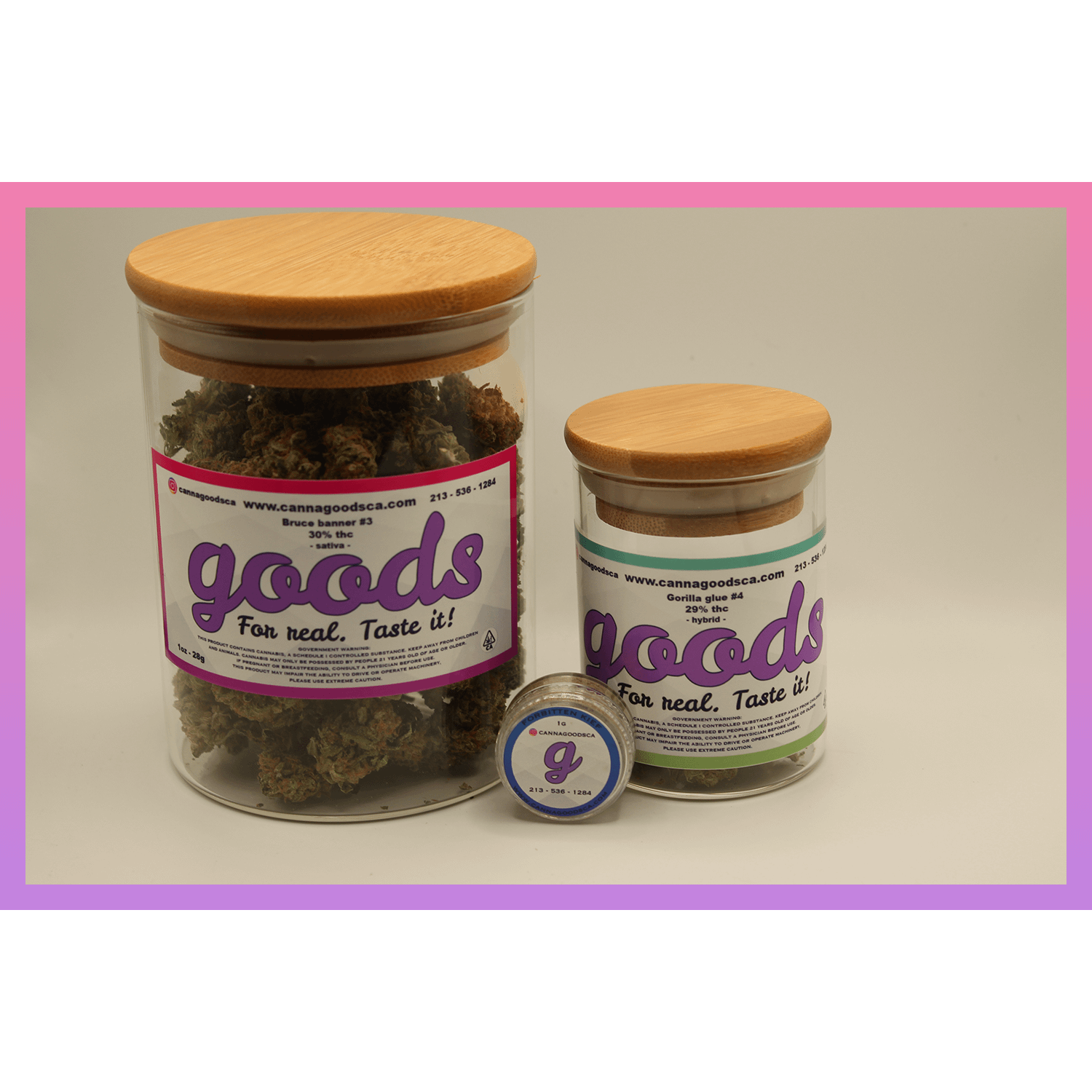 Glass containers are only for the purpose of illustration. Products are packaged with Mylar Bags.